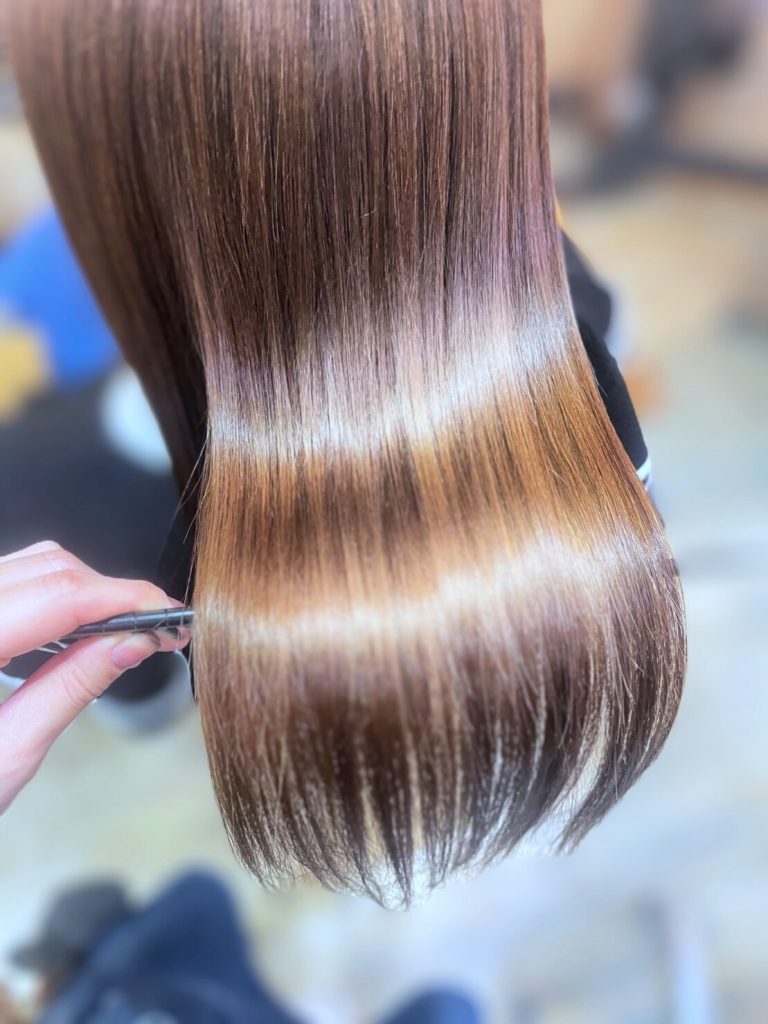 さらに、湿気や雨の日でも広がりにくく、一日中きれいな状態をキープ。カラーや白髪染めをしている髪にも対応できるため、幅広い髪質の方に人気があります。回数を重ねるほど髪の内部が整い、扱いやすい髪へと変化していくのも特徴です。