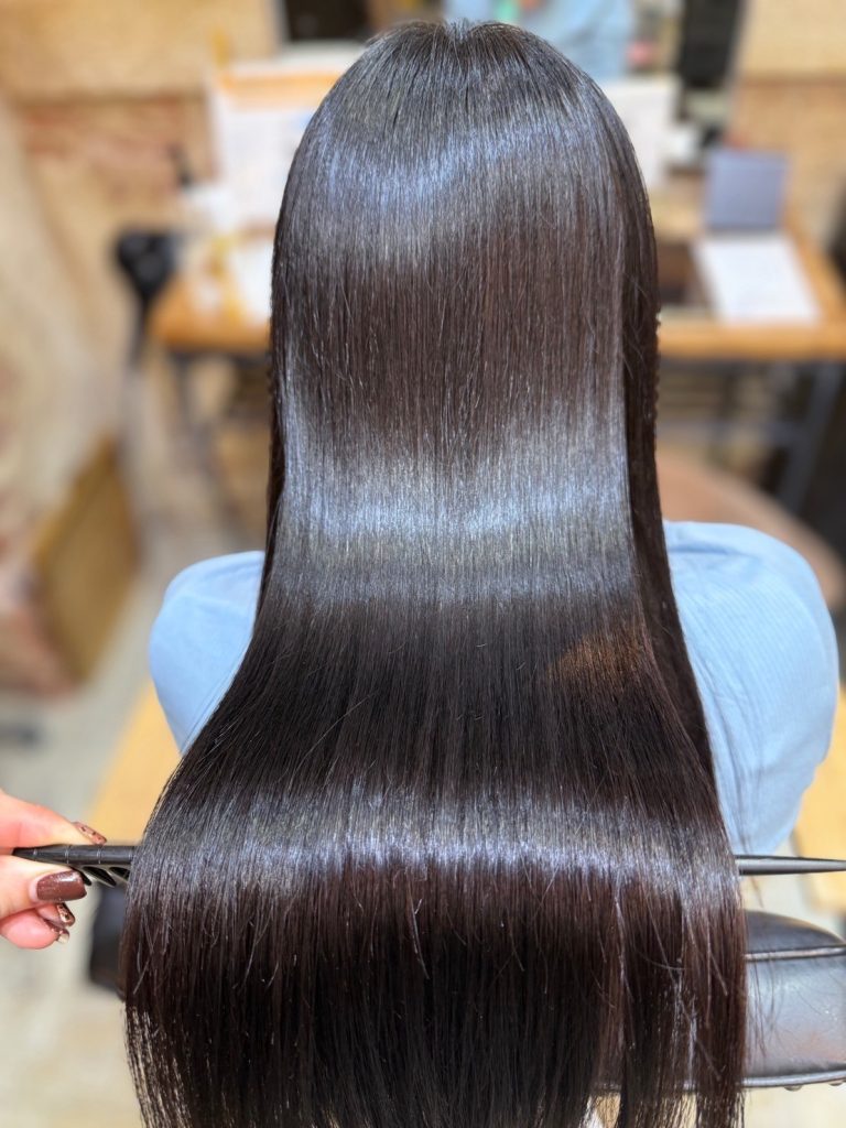 施術後は、まるで自分の髪じゃないようなサラサラ感と手触りの良さに驚く方がほとんど。乾かすだけでまとまるようになり、アイロンやブローにかけていた時間が短縮されるのも嬉しいポイントです。湿気や雨の日でも広がりにくく、一日中ツヤをキープできます。