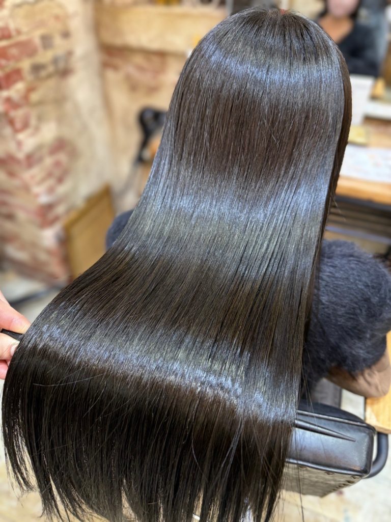 そこで選ばれているのが、年齢による髪の変化を前提に考えた髪質改善ストレートエステです。この施術は、クセをただ強く伸ばすのではなく、髪の状態に合わせて薬剤や工程を調整しながら行います。髪に必要な水分や内部のバランスを整えつつクセをコントロールするため、仕上がりはとても自然で、柔らかさを感じられるストレートになります。