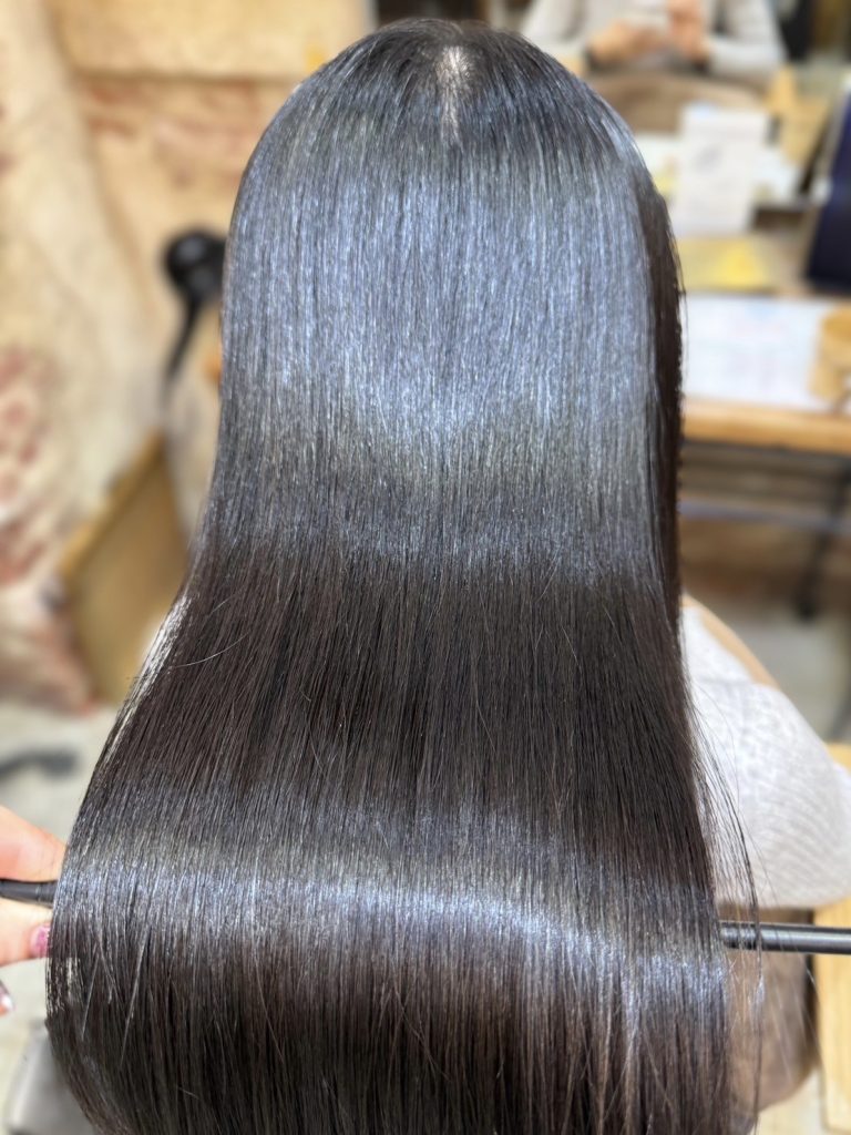 これはトリートメントだけで手触りを整える施術ではありません。縮毛矯正をベースにしながら、髪に配慮した薬剤を使い、クセや広がりを伸ばしていくメニューです。髪の形そのものを整えるからこそ、表面に光がきれいに反射し、自然な艶が生まれます。
