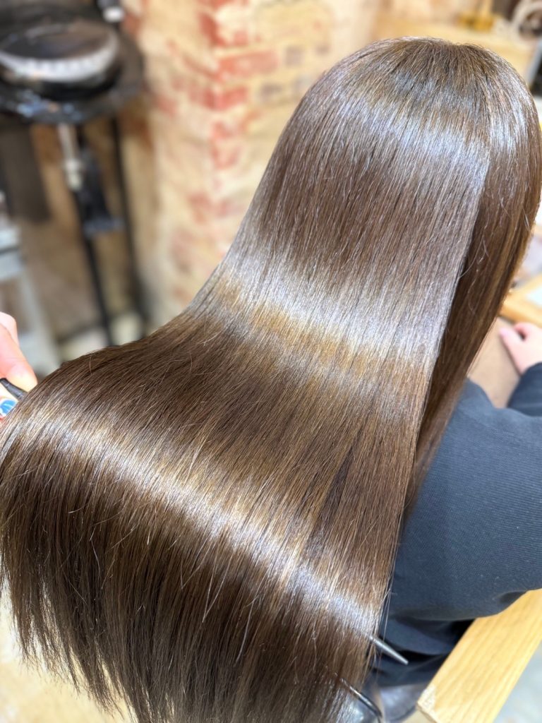 このカラーは ただ色を入れるだけではなく 髪の内部に栄養と水分を補いながら染めていく施術です。アミノ酸や補修成分が髪の中に入ることで ダメージ部分が整い 手触りが柔らかくなります。実際 乾かした後のまとまりが良くなり ツヤも自然に出るようになりました。